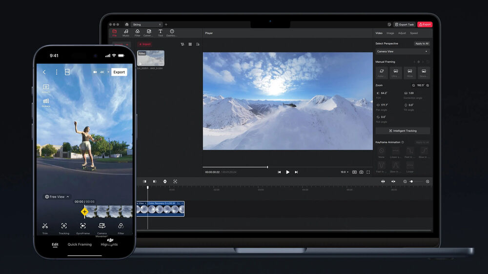 Las aplicaciones DJI Fly y Studio te ayudan a mejorar tus grabaciones mientras rastreas sin esfuerzo personas, vehículos, barcos y más con Avata 360°. Algunas de sus funciones incluyen: