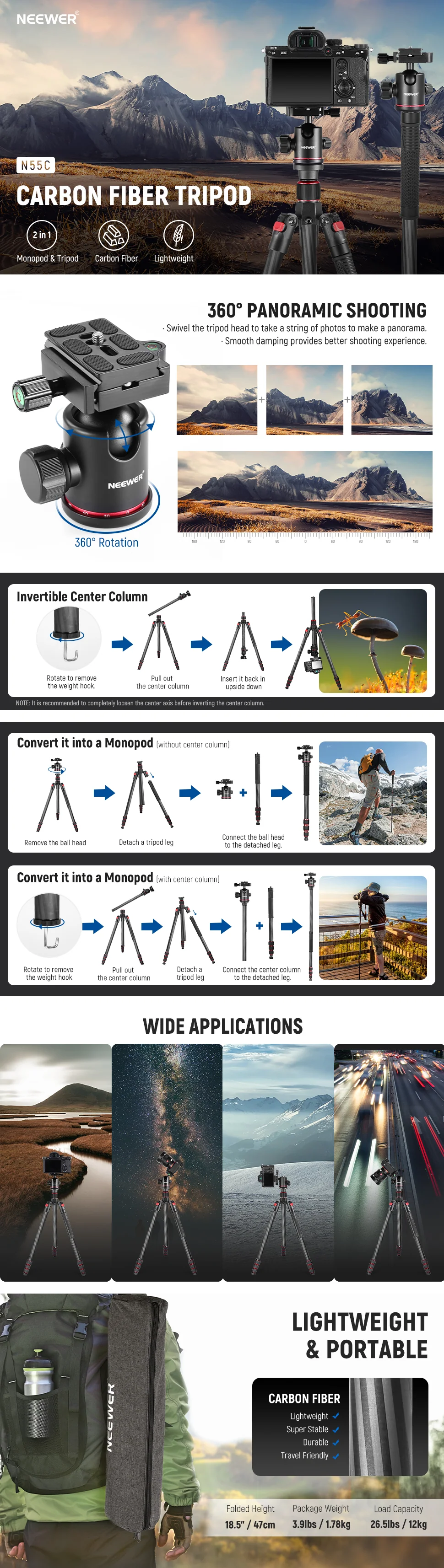 Gracias a su pata desmontable y columna central extraíble, el trípode de fibra de carbono Neewer permite transformarse en un monópode (altura máxima con columna central: 180 cm / 70.9”) para distintas aplicaciones fotográficas, como fotografía de naturaleza, macrofotografía y retratos.