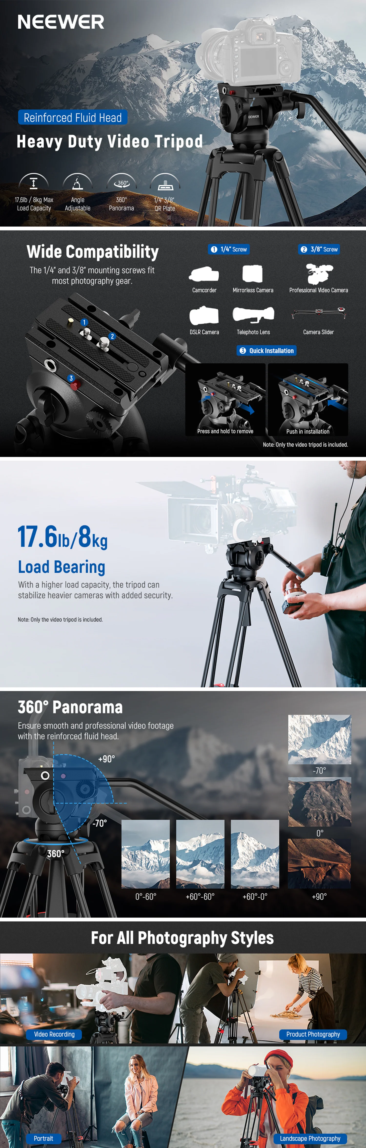 Trípode de Video Metálico Estable (Versión Básica) – Este trípode de cabezal fluido completamente metálico ofrece una estabilidad excepcional y está diseñado para soportar un uso riguroso. Cada pata está compuesta por tubos de varias filas, con un esparcidor triangular central y un chasis ampliado de 73mm que soporta hasta 17.6lb/8kg. Las patas de goma antideslizantes proporcionan un soporte estable en cualquier terreno y son resistentes al desgaste para una durabilidad prolongada. Ideal para filmación, grabación de video, fiestas, bodas, eventos deportivos, paisajes, etc.