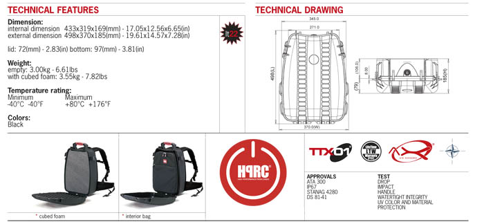 La Mochila 3500F con Cubed Espuma de HPRC (High Performance Resin Cases) es una mochila de moldeado por inyección que es hermético, hermético y prácticamente a prueba de golpes. Está hecha de polipropileno TTX01 resina plástica con una superficie de micro-textura para reducir el rascado. Este caso tiene un interior de espuma en cubos.